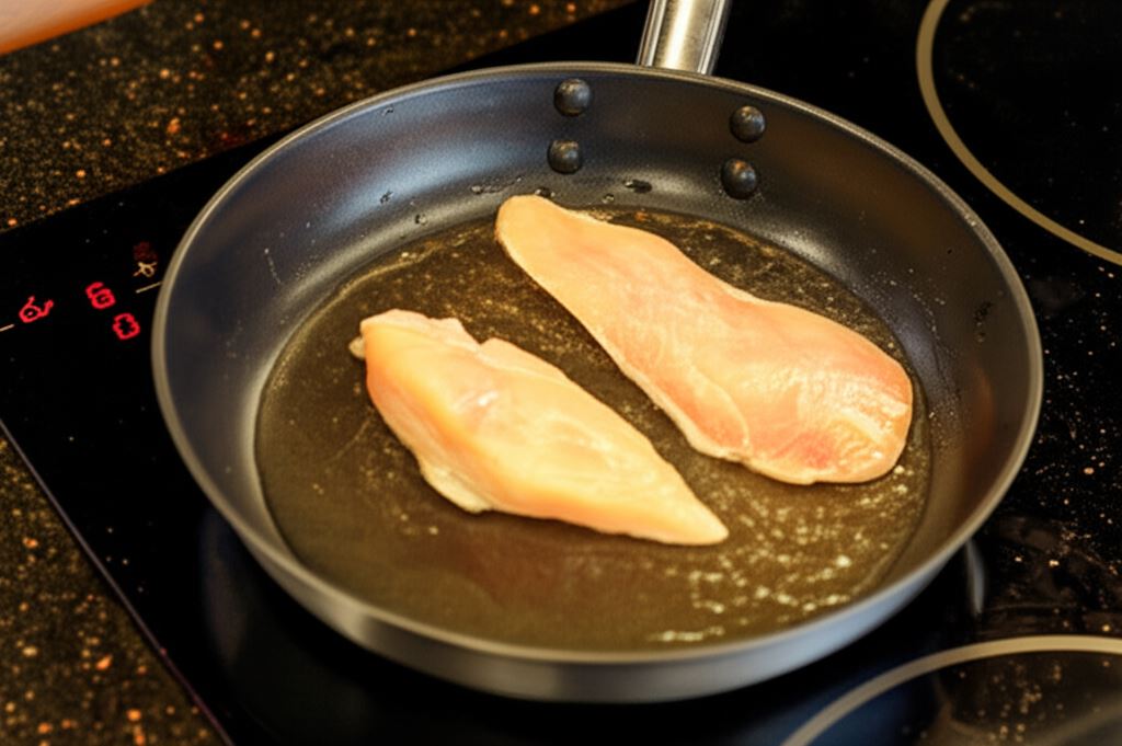 Posiekaj kurczaka i zrumień go na patelni, używając niewielkiej ilości oliwy, aż nabierze brązowego koloru.