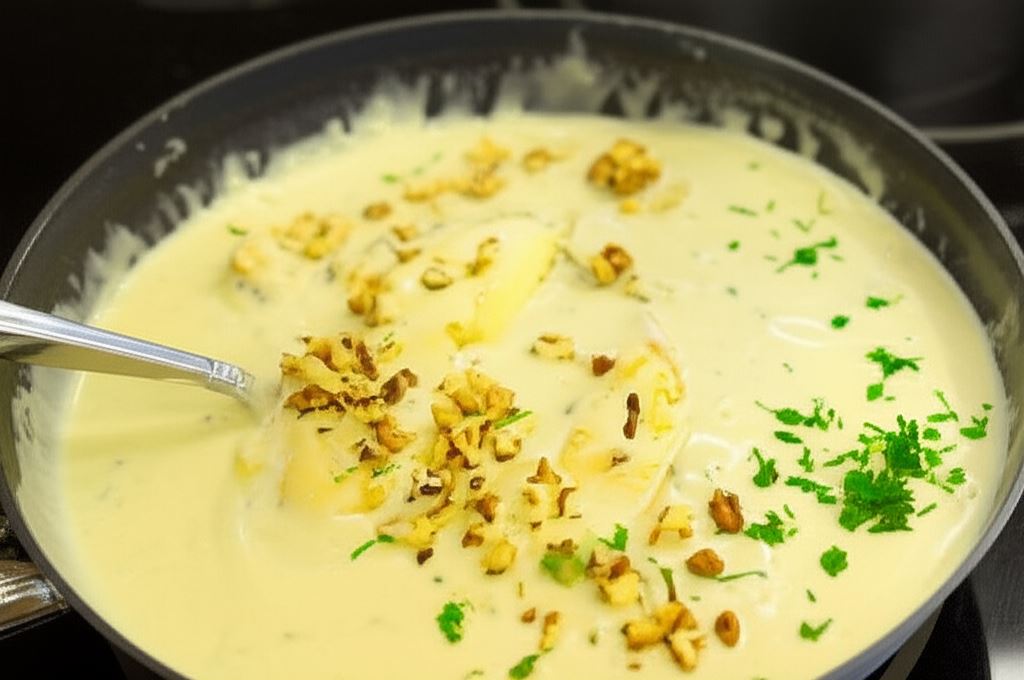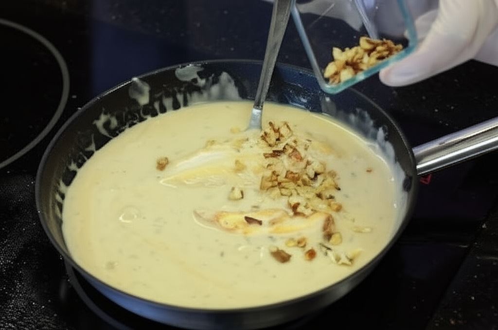 Prażenie orzechów włoskich na suchej patelni przed dodaniem ich do sosu znacząco wzbogaca smak całego dania. Orzechy uwalniają swój intensywny aromat i zyskują przyjemną chrupkość, która świetnie kontrastuje z kremową konsystencją sosu.