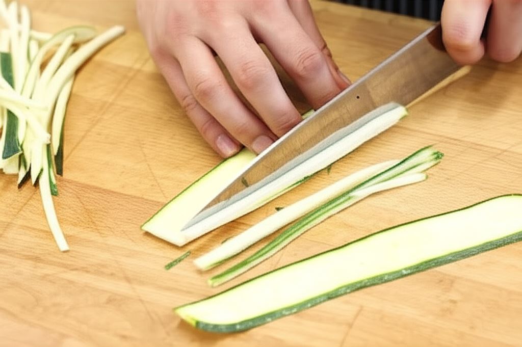 Cukinie opłucz, potnij w cienkie paski lub wykorzystując specjalną tarkę – mandolinę z odpowiednimi ostrzami, pokrój w długi makaron.