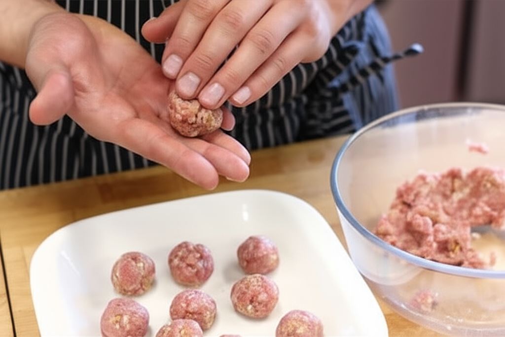 Mięso mielone wymieszaj z przyprawą do mięsa mielonego, nada ona kotlecikom właściwego smaku. Z przyprawionego mięsa uformuj możliwie najmniejsze kulki, podsmaż je na patelni i odłóż na bok.