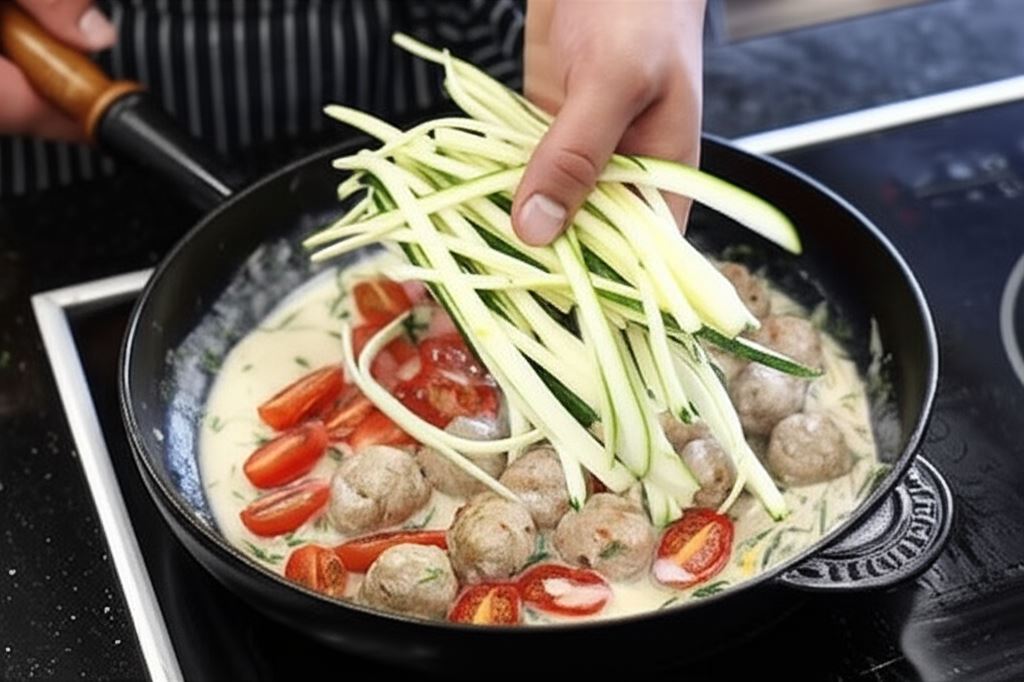 Na tej samej patelni zrumień pokrojoną w paski cebulę i posiekany czosnek, dolej pół szklanki wody, dodaj śmietanę i posiekany koperek, włóż z powrotem mięsne kulki, całość gotuj moment, dodaj pokrojoną wcześniej cukinię i pomidorki przecięte na połówki. Wszystko razem przez chwilę mieszaj, aby cukinia zmiękła.