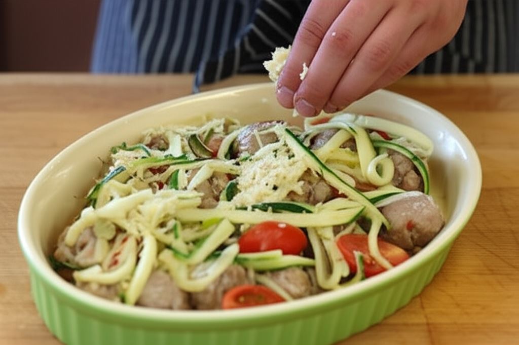 Odkryj nową odsłonę klasycznej zapiekanki! Zamiast tradycyjnego makaronu wykorzystaj cukinię pokrojoną w długie, cienkie paski, która doskonale imituje spaghetti, jednocześnie dodając lekkości całemu daniu. Soczyste mini pulpeciki, delikatny sos śmietanowo-koperkowy i chrupiąca, złocista skorupka z sera i bułki tartej tworzą kompozycję, która zachwyci podniebienie każdego domownika.