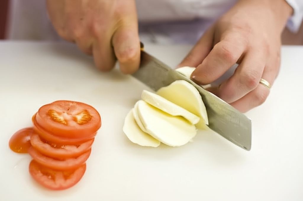 Usuń z pomidorów twarde jasne miejsca przy szypułkach. Pokrój na cienkie plastry.