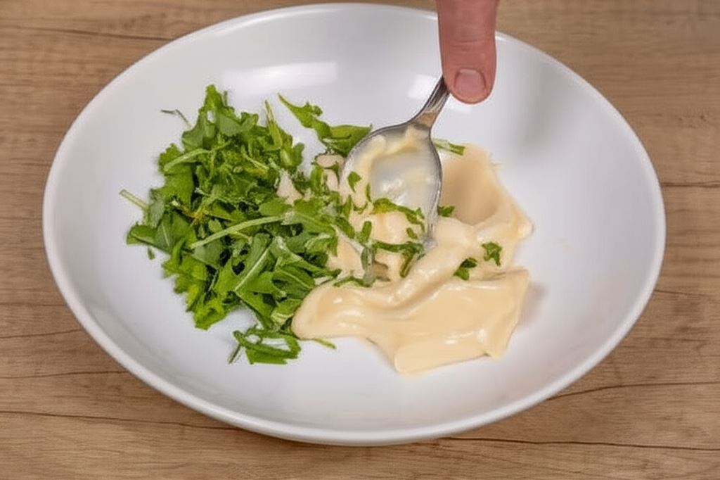 Rukolę pokrój nożem, połącz z majonezem. Posiekaj chili.
