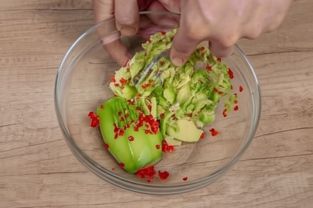 Obierz awokado, wymieszaj z oliwą, rozgnieć widelcem i połącz chili z jajami, przypraw do smaku sokiem z połowy cytryny i solą.