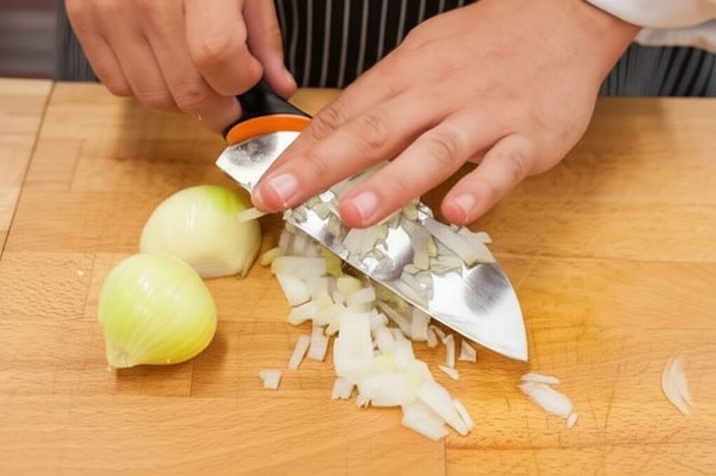 Cebulę posiekaj w kostkę. Obsmaż na nagrzanej patelni z tłuszczem, aż uzyska złoty kolor.