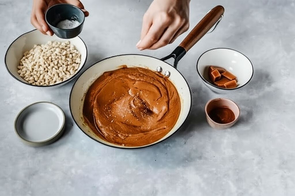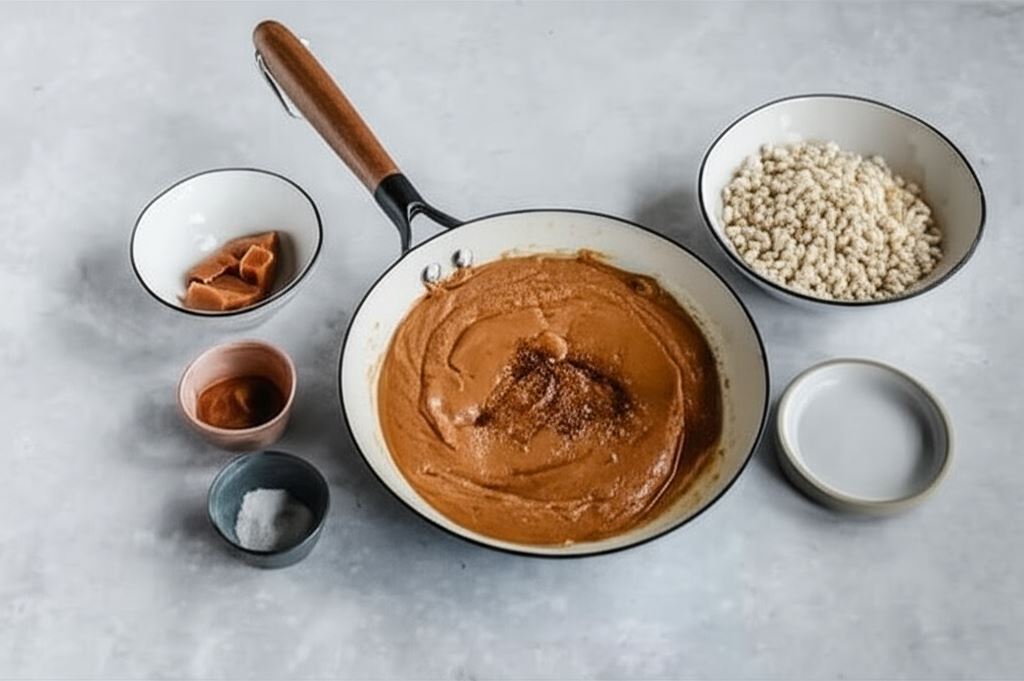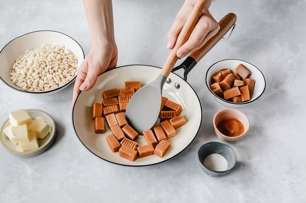 Za karmelowy smak odpowiedzialne są krówki – popularne cukierki produkowane z mleka, cukru i masła. Składniki te są mieszane i gotowane w dużych naczyniach, a następnie krojone i pakowane. Tradycyjne krówki mają konsystencję, która idealnie nadaje się do rozpuszczenia i połączenia z ryżem preparowanym.