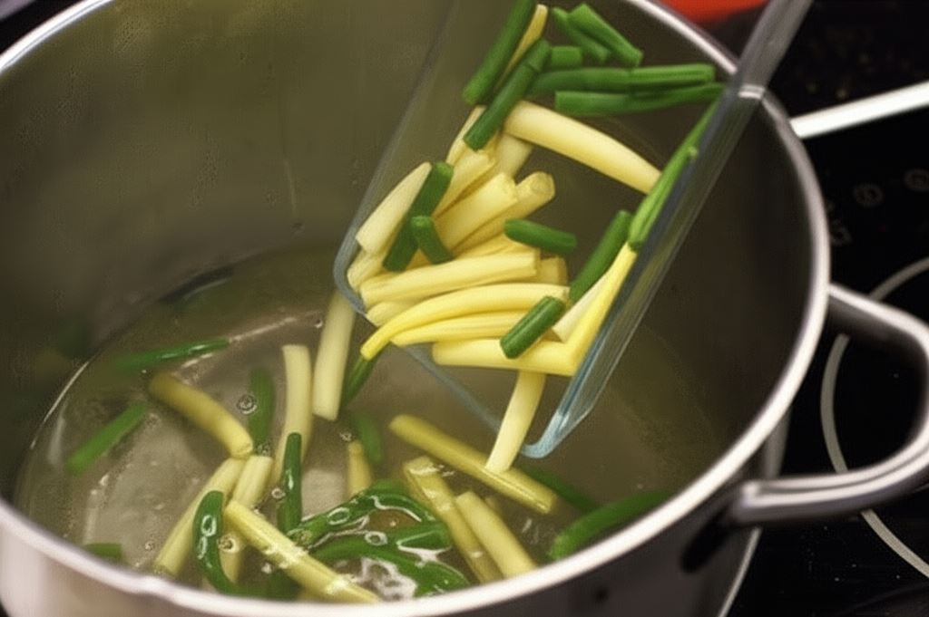 Fasolkę opłucz, odetnij jej końcówki i przetnij na pół. Gotuj w posolonej wodzie przez około 10 minut. Potem zalej zimną wodą i odłóż na bok.