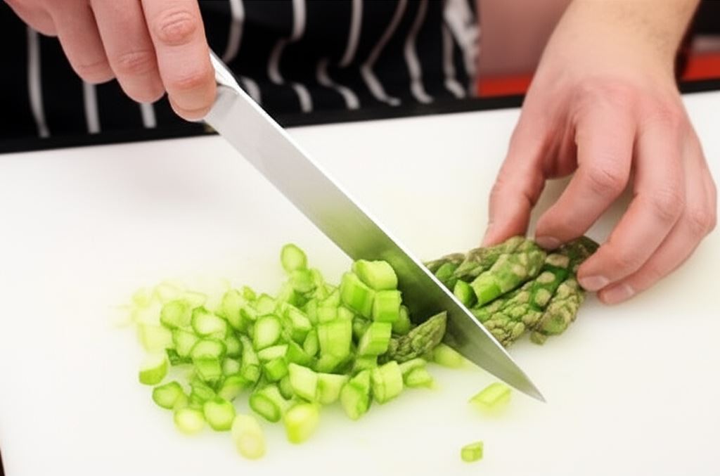 Szparagi opłucz, potem odetnij zdrewniałe końce. Odetnij z każdego szparaga górną część wraz z fragmentem łodyżki. Pozostałą część łodyżek podziel na mniejsze kawałki.