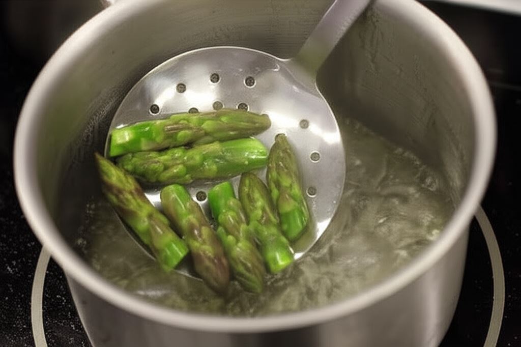 W garnku podgrzej oliwę, zrumień cebulę, wsyp pokrojone szparagi i obrane ziemniaki. Wszystko zalej 500 mililitrami wody i wrzuć kostkę Bulionu na włoszczyźnie Knorr. Wlej mleko, 1 szczyptę gałki muszkatołowej i 2 szczypty pieprzu cayenne.