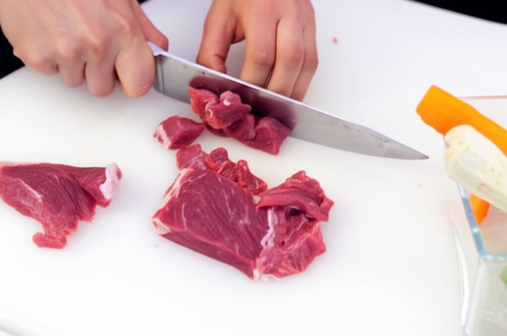 Mięso potnij w kostkę o wymiarze 1 centymetra. Tak samo pokrój wszystkie warzywa, to znaczy ziemniaki, marchewkę, pora, cebulę, pietruszkę oraz selera.