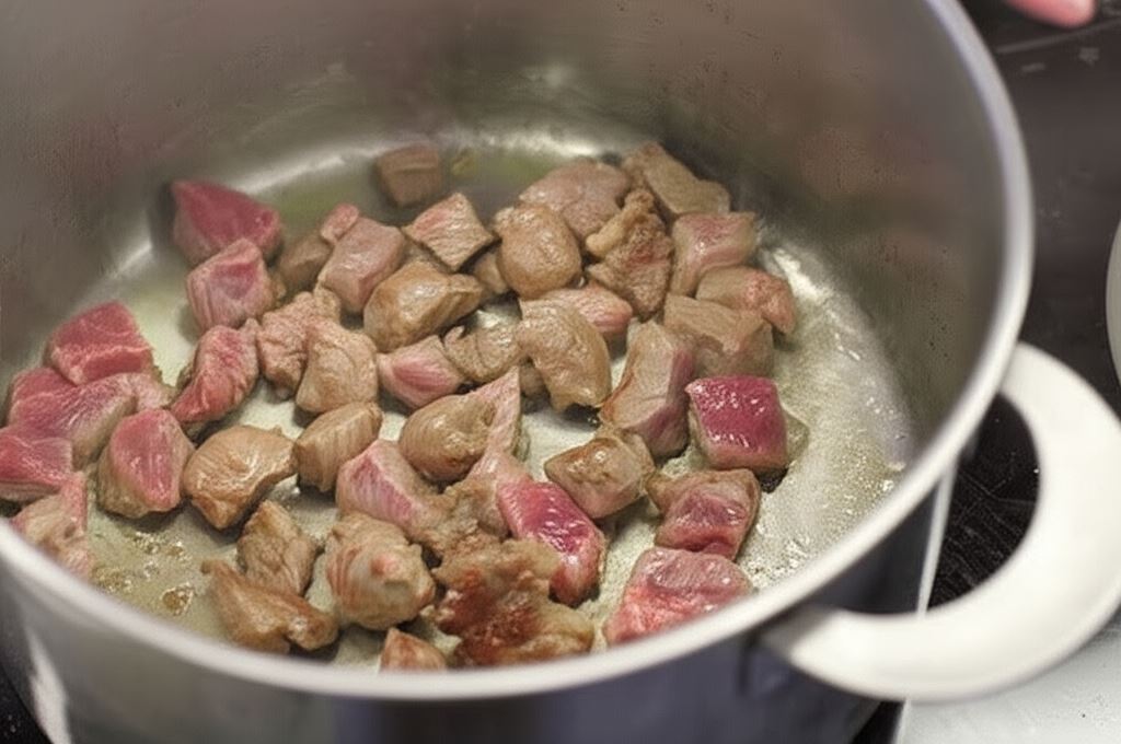 W rondlu roztop tłuszcz i gdy się porządnie nagrzeje obsmażaj mięso. Po chwili wsyp wszystkie warzywa z wyjątkiem ziemniaków. Całość smaż przez 5-6 minut.