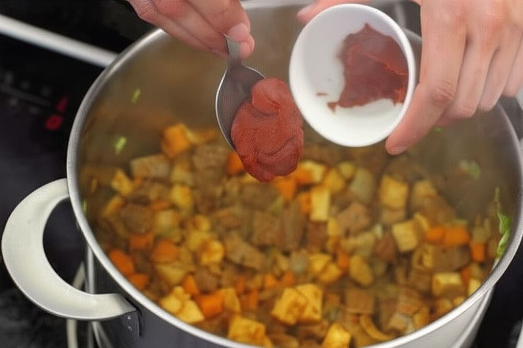 Na koniec wlej koncentrat pomidorowy i kontynuuj smażenie przez następne kilka minut.