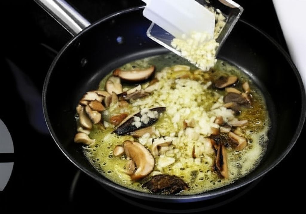 Przesmażaj na tłuszczu do miękkości grzyby z cebulą i czosnkiem, pilnując, by się nie przypaliły.
