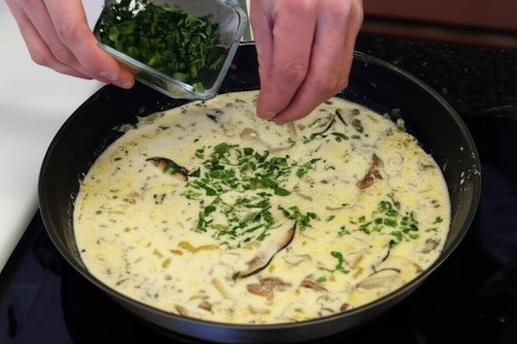 Wlej sos do grzybów, zamieszaj. Dodaj pietruszkę, potem dopraw do smaku pieprzem i solą jeśli jest taka potrzeba.
