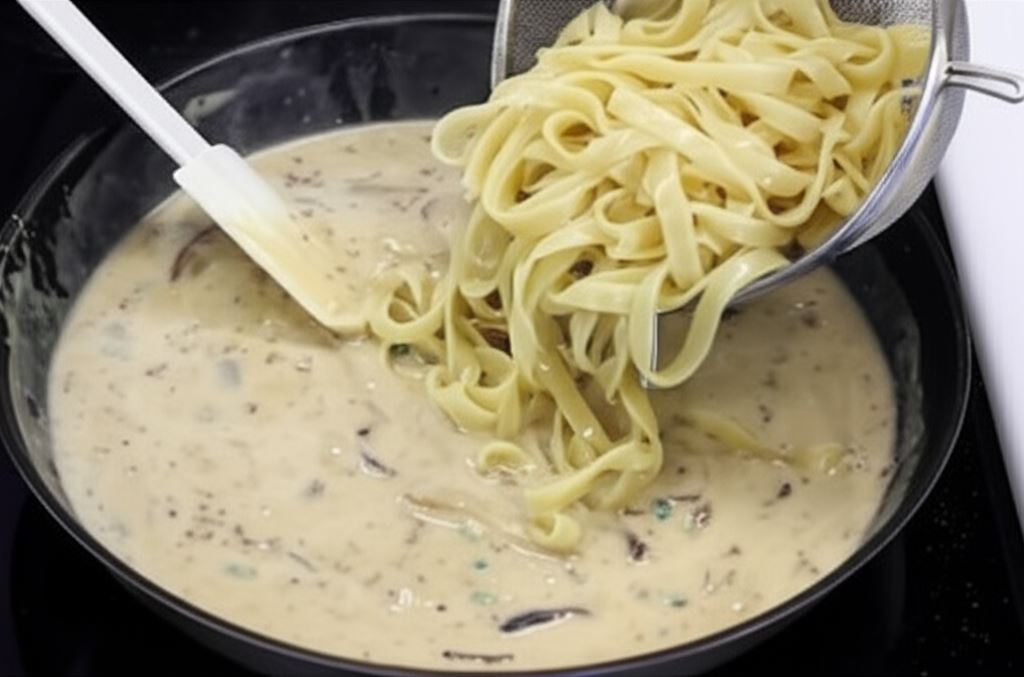 Połącz przygotowany sos z dopiero ugotowanym makaronem i natychmiast serwuj.