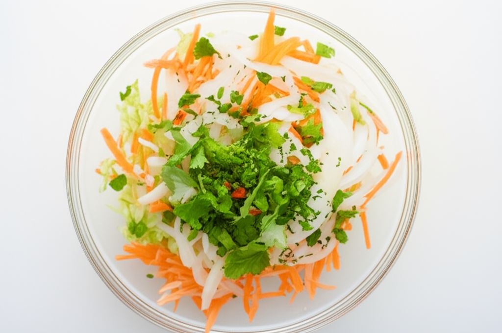 Umieść warzywa w misce. Dodaj podarte liście bazylii i kolendry oraz posiekany szczypiorek z dymki.