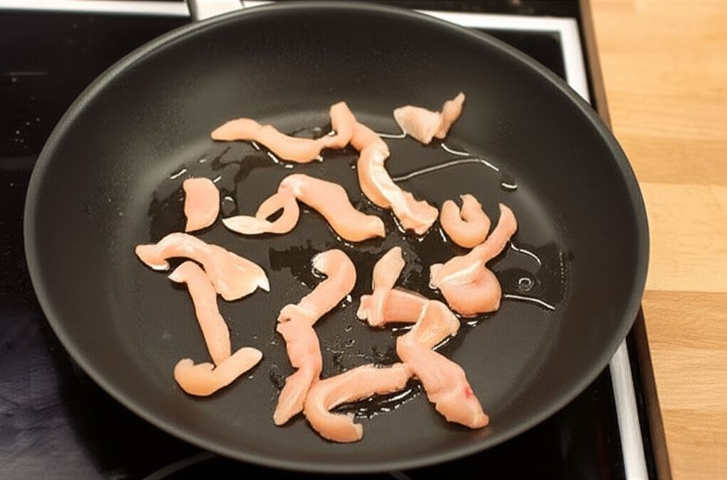 Kurczaka pokrój na cienkie paski i obsmaż na patelni. Możesz go przyprawić wedle upodobania. Makaron ugotuj.