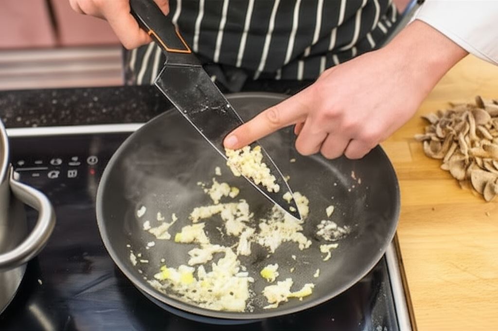 Posiekaj cebulę i czosnek, następnie podsmaż je na patelni. Ugotuj makaron.