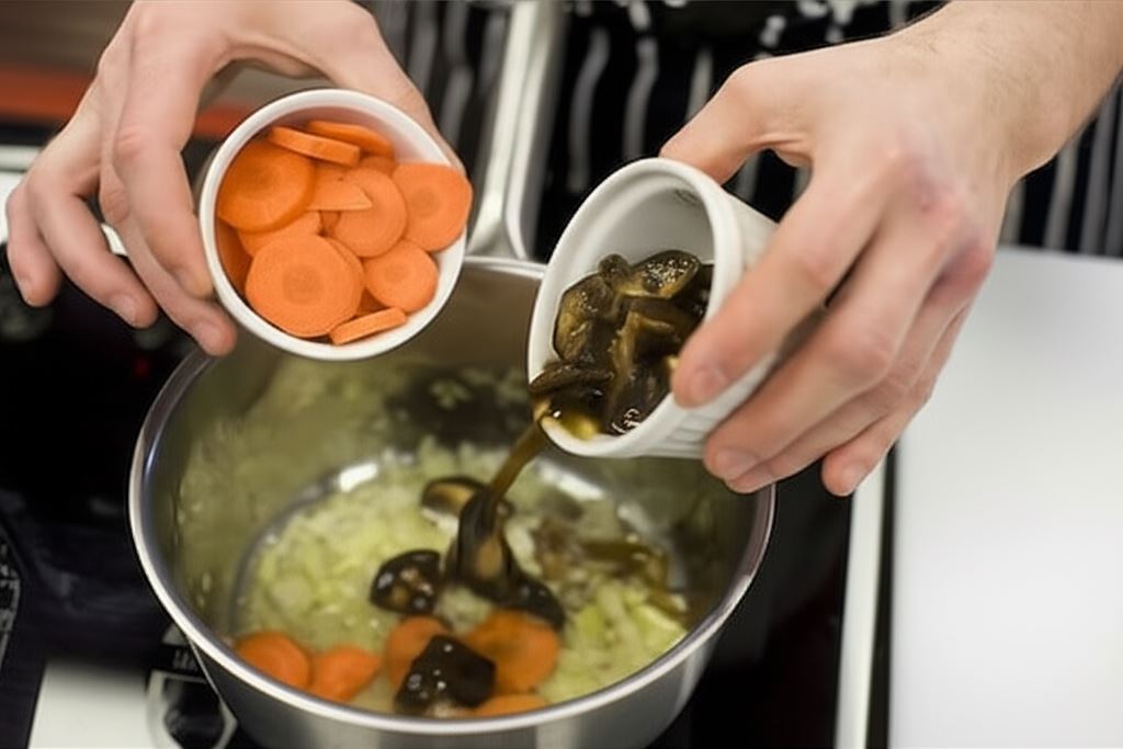 Na rozgrzanej oliwie zeszklij cebulę, wsyp marchewkę i grzyby. Podsmaż i zalej 1 litrem wody. Gotuj przez około 15 minut.