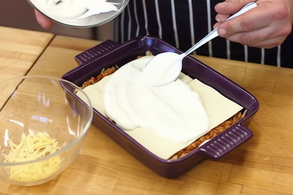 Naczynie żaroodporne o wymiarach 28x20 cm posmaruj śmietaną i wyłóż trzema arkuszami makaronu. Następnie posmaruj śmietaną, posyp tartym serem i rozprowadź warstwę mięsnego sosu. Przykryj arkuszami makaronu, znów posmaruj śmietaną, posyp serem i rozprowadź mięsny sos. Powtarzaj tę czynność aż zużyjesz wszystkie składniki (3 warstwy).