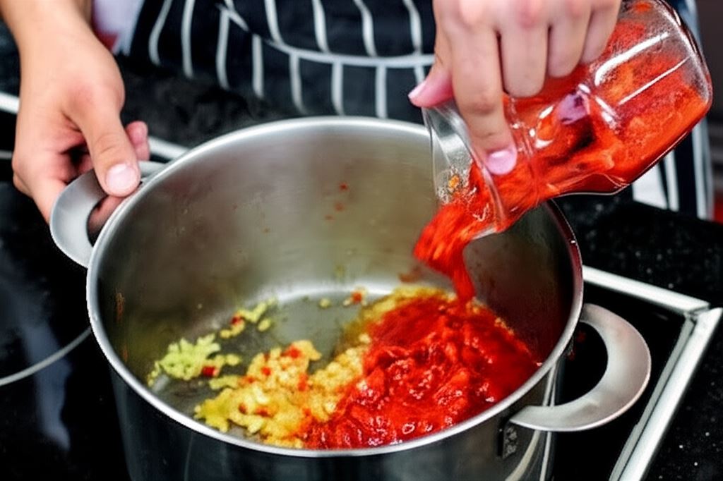 Na rozgrzanej oliwie w garnku zrumień pokrojoną w kostkę cebulę i posiekaną papryczkę chilli. Kiedy cebula zacznie lekko brązowieć wsyp puszkę pomidorów.