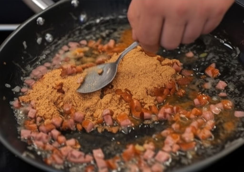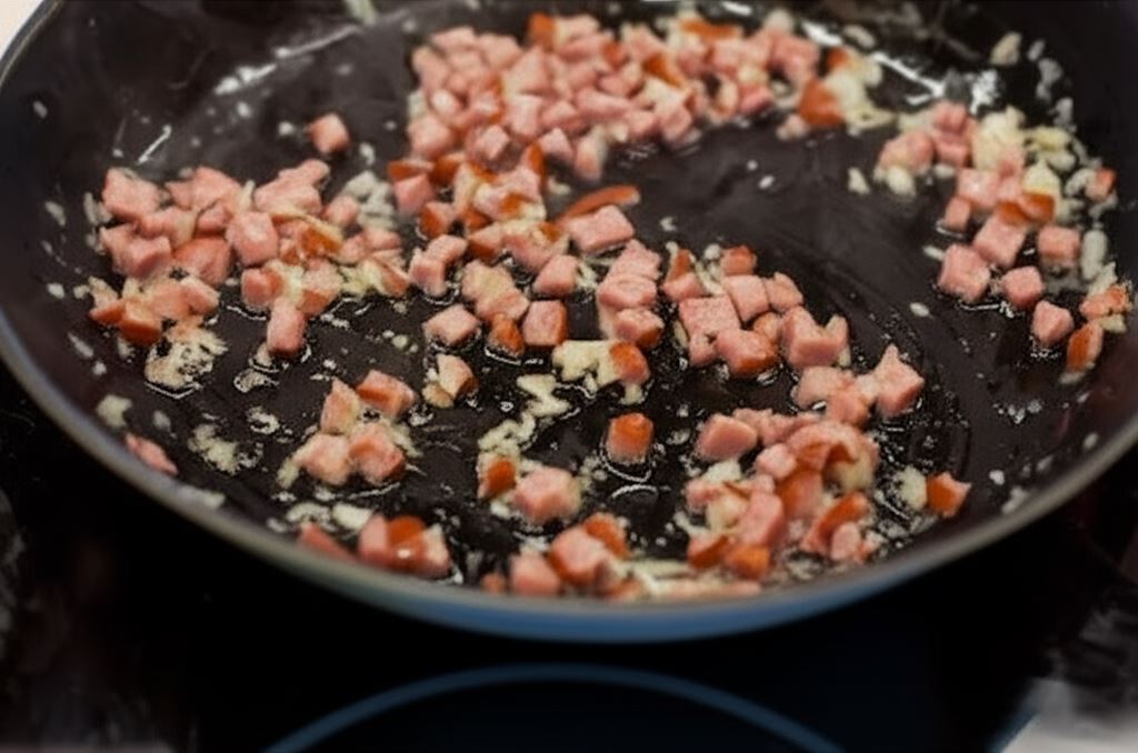Wrzuć pokrojoną w kostkę kiełbasę i zrumień ją.