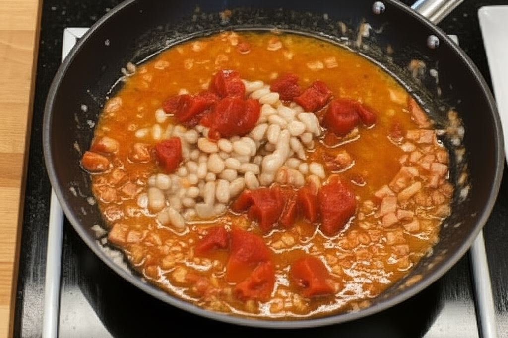 Fasolę odcedź, pomidory z puszki posiekaj i wsyp wszystko na patelnię.