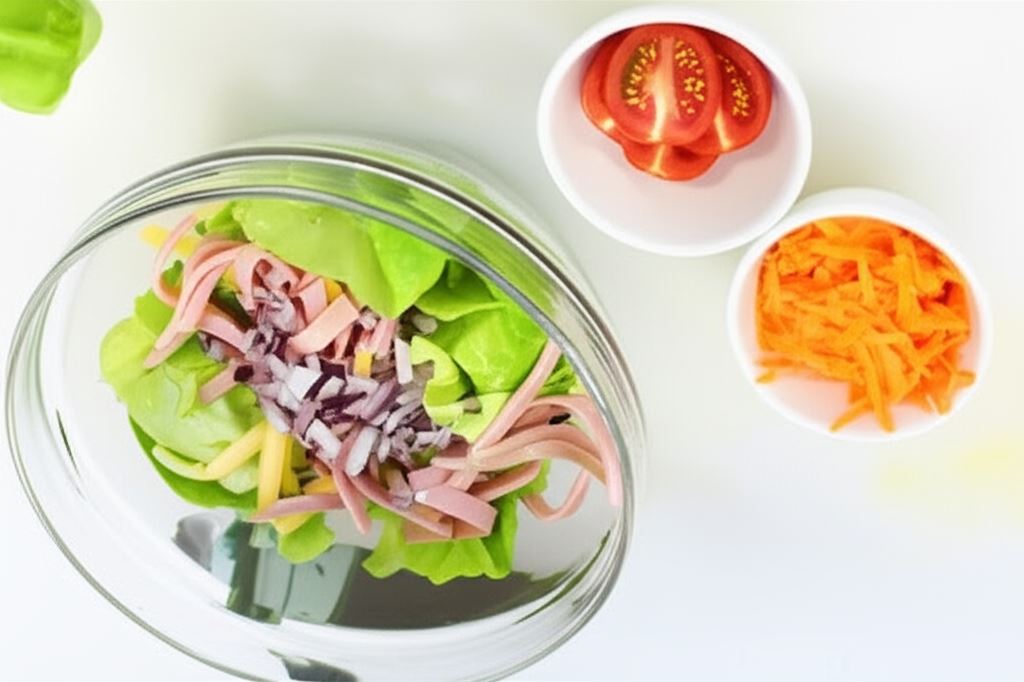 Do miski wrzuć porwaną sałatę, ser i szynkę pociętą na paski, utartą marchew, pomidory przekrojone na połówki i posiekaną cebulę.