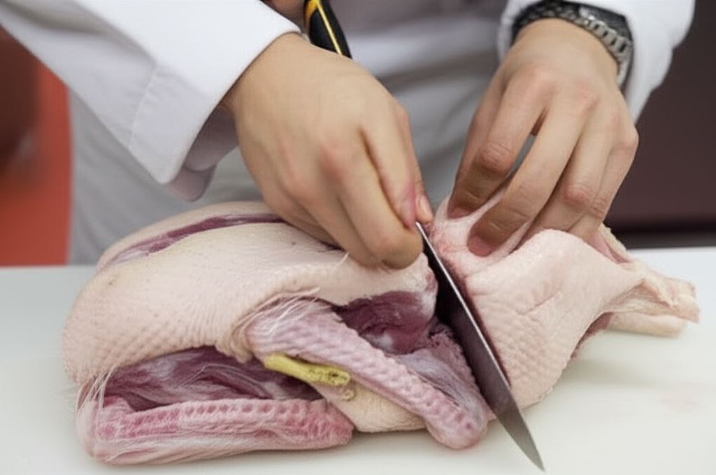 Kaczkę opłucz i przekrój na połowę. Odetnij skrzydła, szyję i kręgosłup.