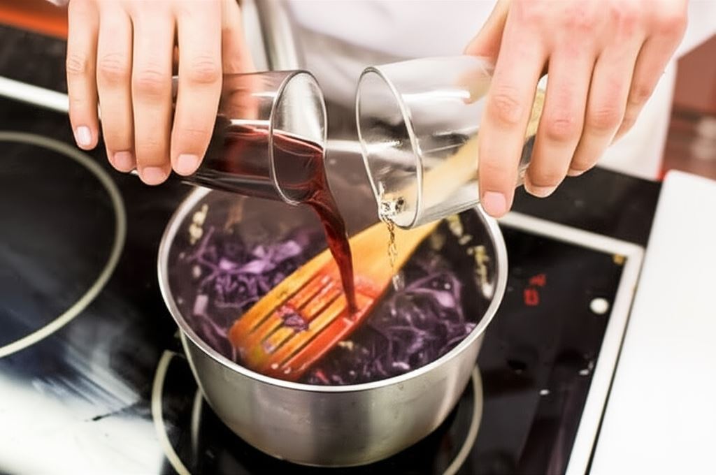 Po krótkim smażeniu dodaj margarynę, zalej wodą i winem. Duś przez 30 minut.