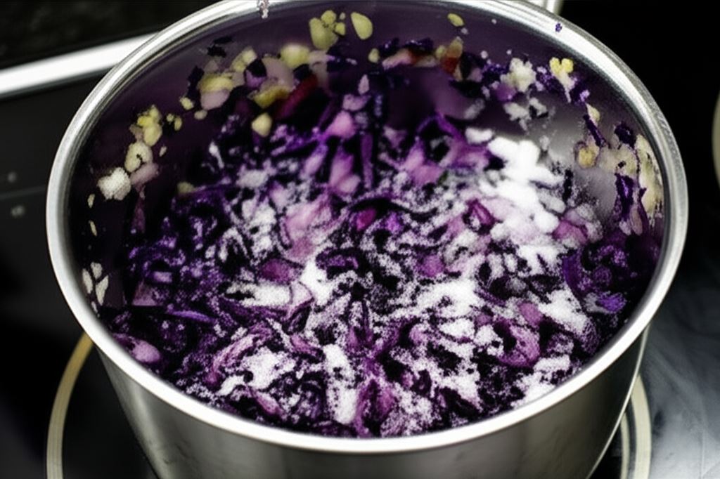 Przypraw kapustę według uznania cukrem i sokiem cytrynowym. Posyp mąką, starannie zamieszaj.