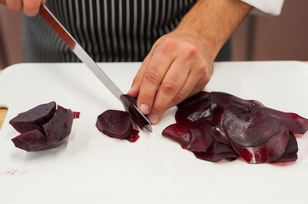 Buraki ugotuj w skórkach do półmiękka, ostudź i obierz. Pokrój na cienkie plasterki.