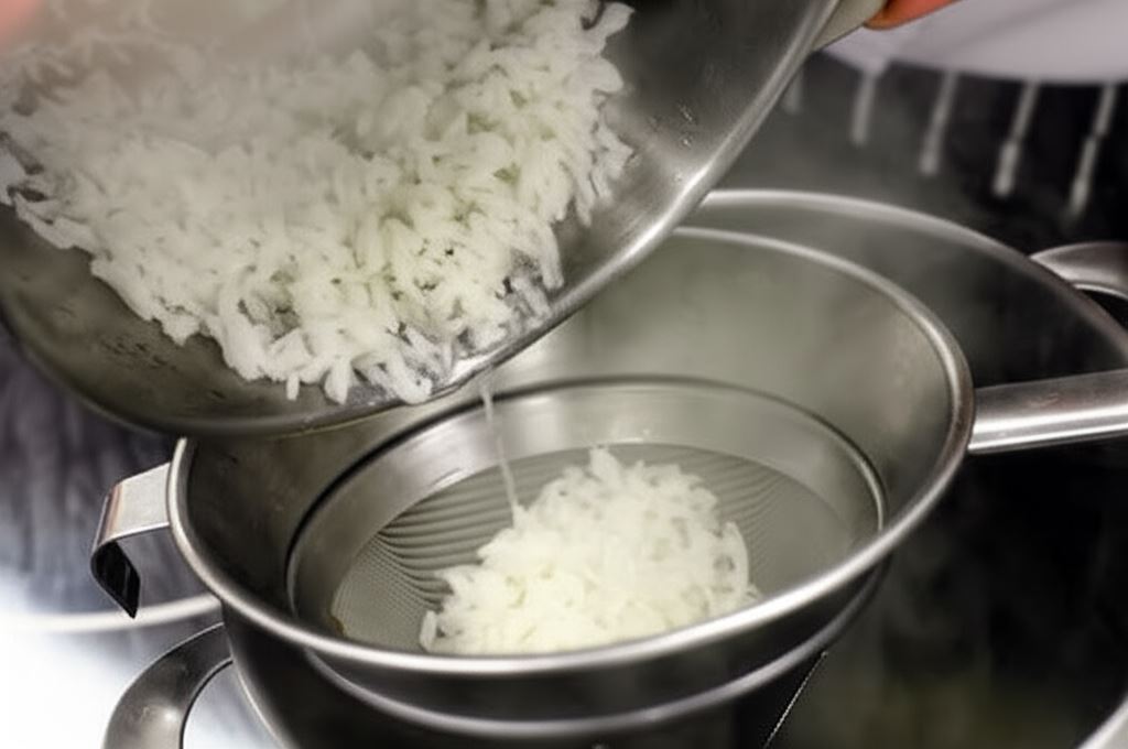 Ryż przygotuj zgodnie z instrukcją na opakowaniu. Potem odcedź go. Powinien być sypki.