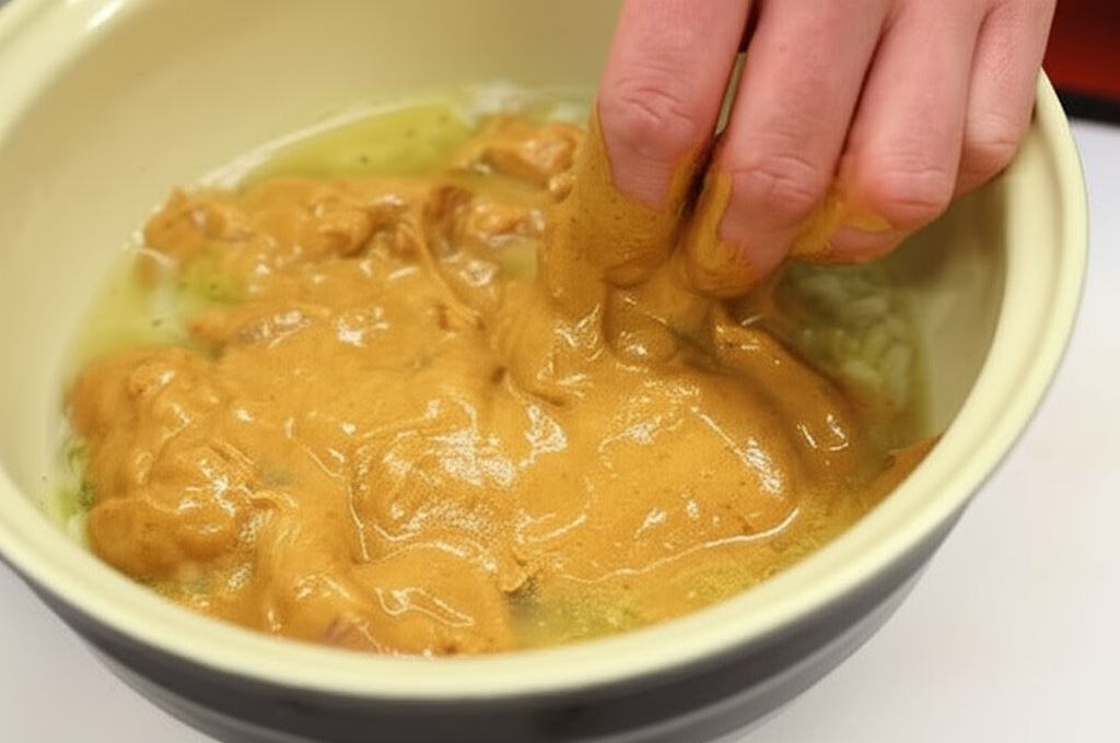 Mięso kurczaka ponacinaj nożem i wymieszaj starannie z połową oleju oraz całą marynatą. Dzięki temu aromat przeniknie również do środka mięsa. Odstaw kurczaka na minimum godzinę.