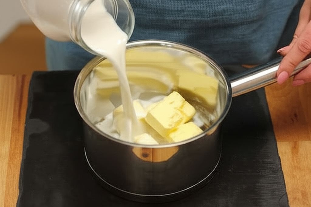Podgrzej masło wraz z mlekiem na niewielkim ogniu. Odstaw na bok, aby ostygło.
