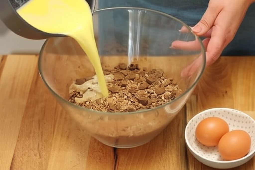 Wymieszaj z przestudzonym masłem z mlekiem i dwoma jajkami. Starannie połącz.