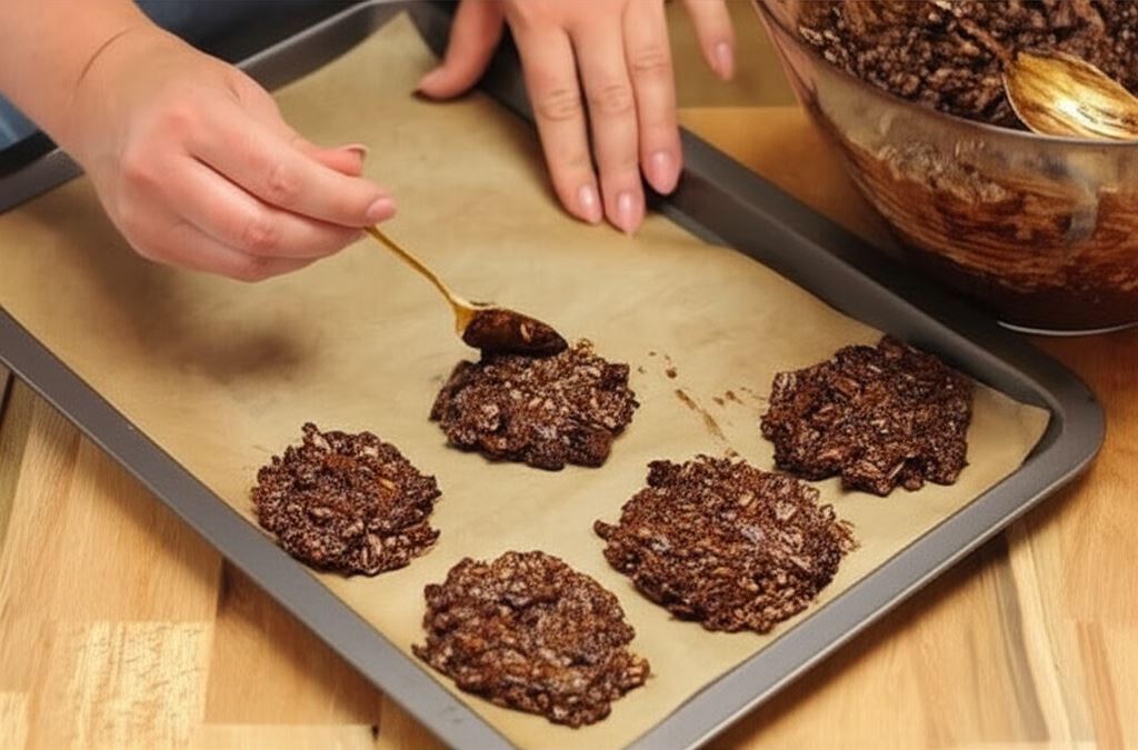 Przygotowane ciasto nakładaj łyżką na blachę wyłożoną papierem do pieczenia, formując niewielkie ciasteczka.
