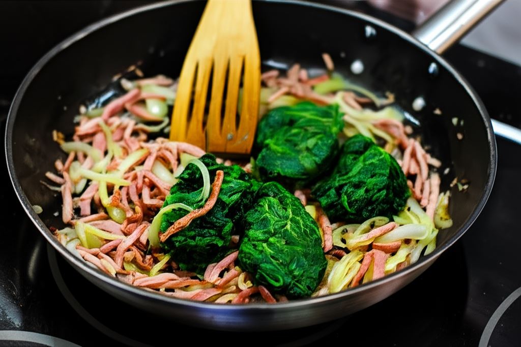 Kostkę Bulionu na włoszczyźnie Knorr połącz starannie z winem. Jajka ubij w miseczce. Cebulę i szynkę potnij w cienkie paski i obsmaż na gorącej oliwie. Potem wsyp rozmrożony szpinak i zamieszaj wszystko. Całość zalej winem z kostką Bulionu na włoszczyźnie Knorr i pogotuj moment, aż płyn wyparuje. Ostudź.