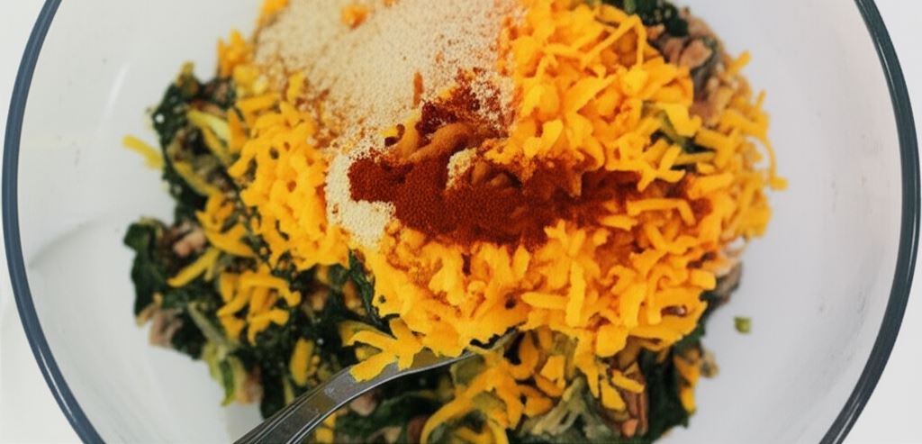 Do ostudzonych liści szpinaku wsyp starty ser, bułkę tartą oraz pieprz cayenne i starannie wymieszaj.