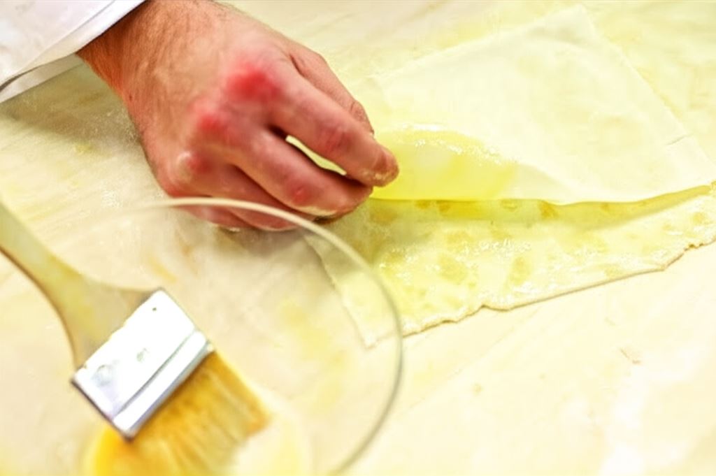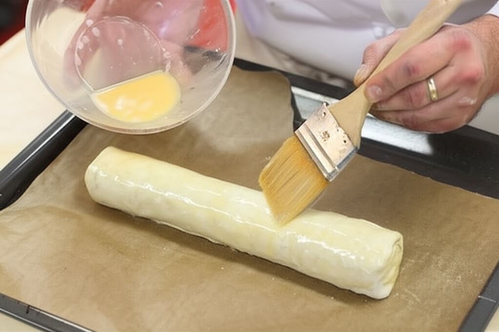 Na przygotowany w ten sposób płat nałóż farsz wzdłuż całej długości, a potem posmaruj jajkiem jeden z dłuższych brzegów ciasta i zwiń roladę. Oba końce podwiń pod spód. Ciasto francuskie rozwałkuj na grubość 2 milimetrów i posmaruj jajkiem. Umieść na nim wcześniej przygotowaną roladę. Całość owiń ciastem francuskim.