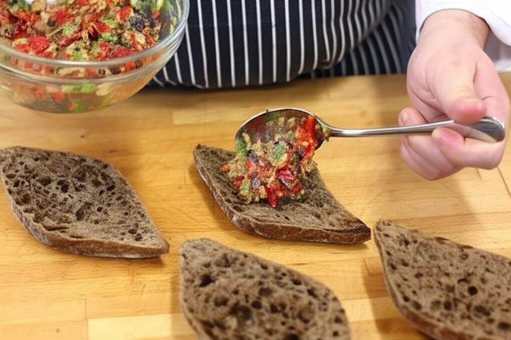 Przekrój bułeczki na połówki, ogrzej w piekarniku lub na grillu, po czym na każdą część nałóż porcję pasty z warzyw.