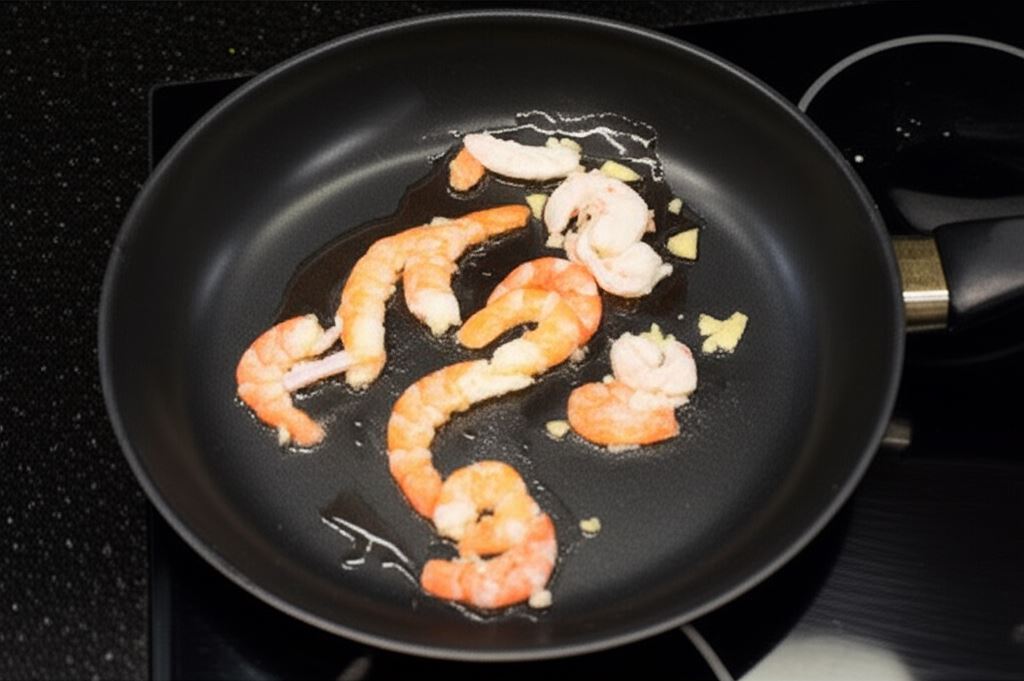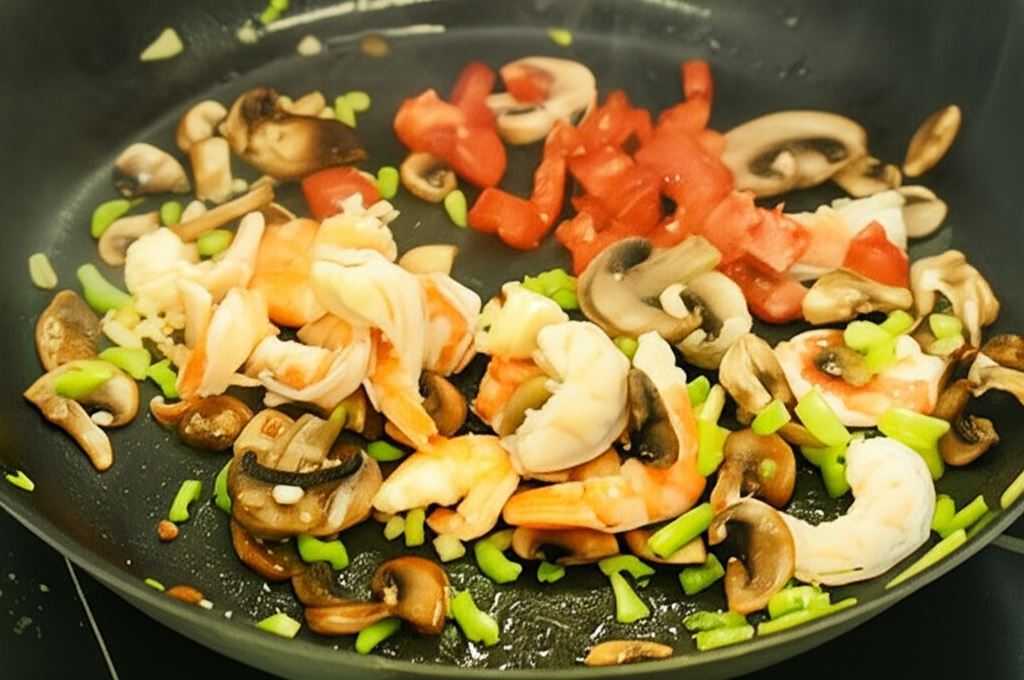 Umieść na patelni z olejem posiekany czosnek i krewetki. Dorzuć po chwili pieczarki i selera naciowego, następnie duś przez 5 minut.
