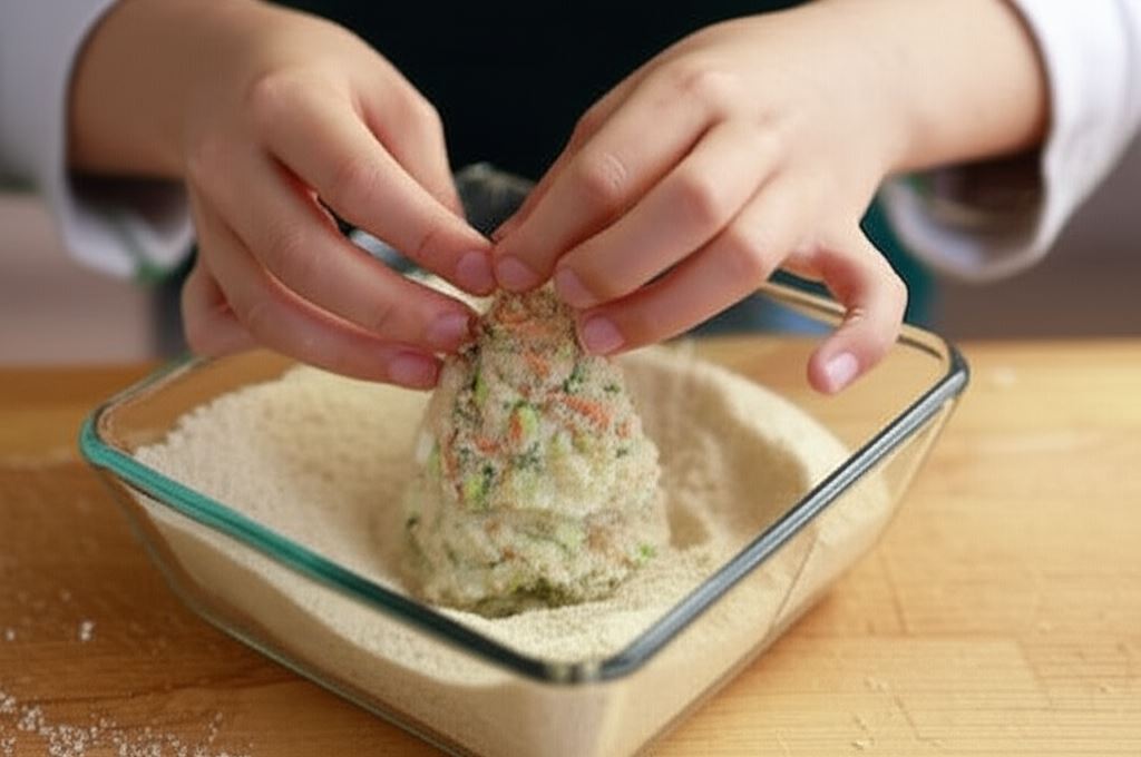 Kształtuj niewielkie placuszki albo cygara (dzieci mogą samodzielnie wybrać formę placuszków i obtaczać je w bułce tartej).