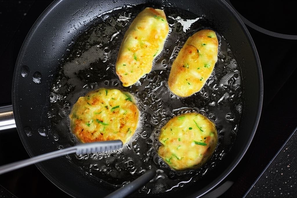 Smaż placki na małym ogniu aż uzyskają złocisty kolor. Podawaj z świeżym twarogiem, ozdobione szczypiorkiem.