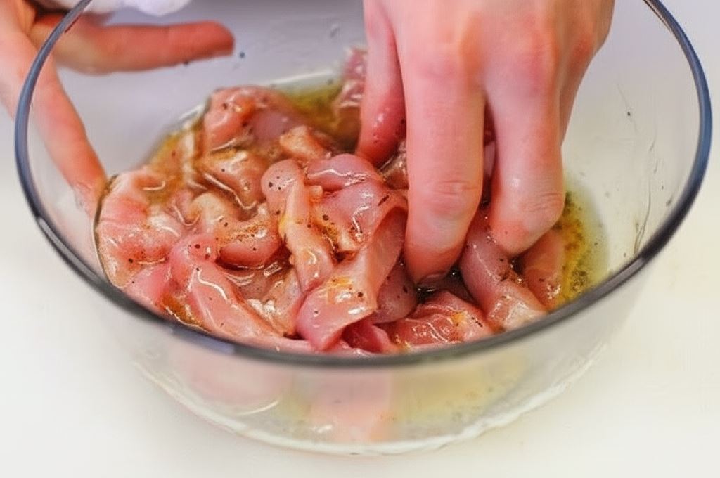 Mięso potnij w drobne paski i umieść w marynacie na 30 minut.
