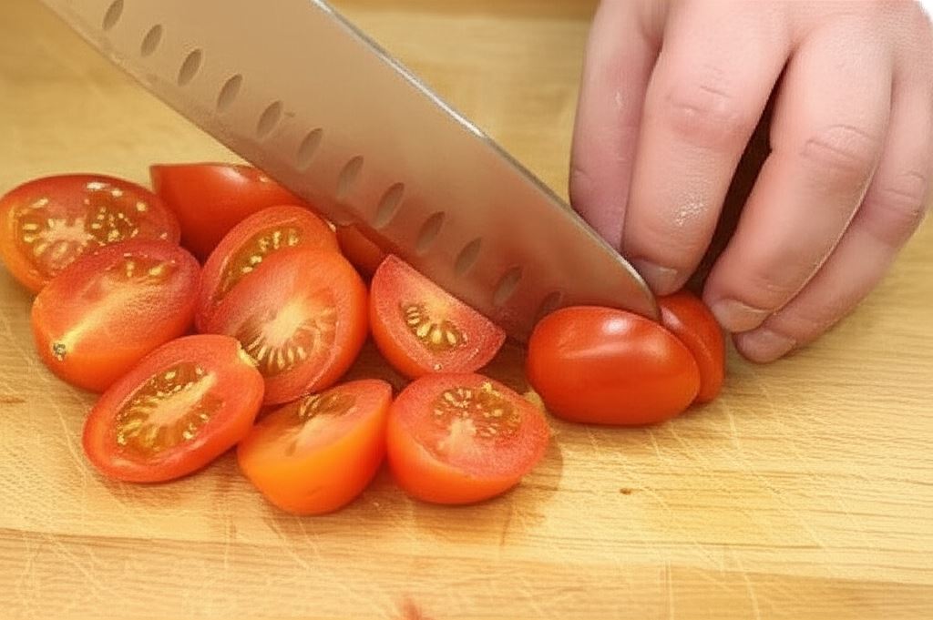Delikatnie obsmaż je na podgrzanej oliwie. Pomidorki przekrój na połówki, żółty ser zetrzyj na tarce.