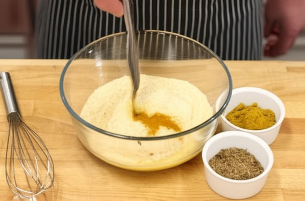 W pojemniku wymieszaj mąkę, wodę oraz przyprawy Knorr – kurkumę, curry i kmin rzymski. Wsyp sól i połącz składniki, by uzyskać jednolite ciasto o konsystencji trochę gęstszej od ciasta naleśnikowego.