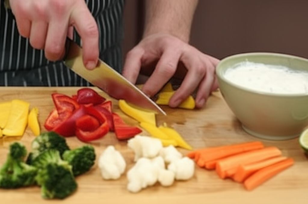 Podgrzej olej w garnku. Warzywa pokrój na małe kawałki lub podziel na różyczki. Wyciśnij sok z limonki i wsyp 1 łyżeczkę do jogurtu oraz drobno posiekanej mięty.