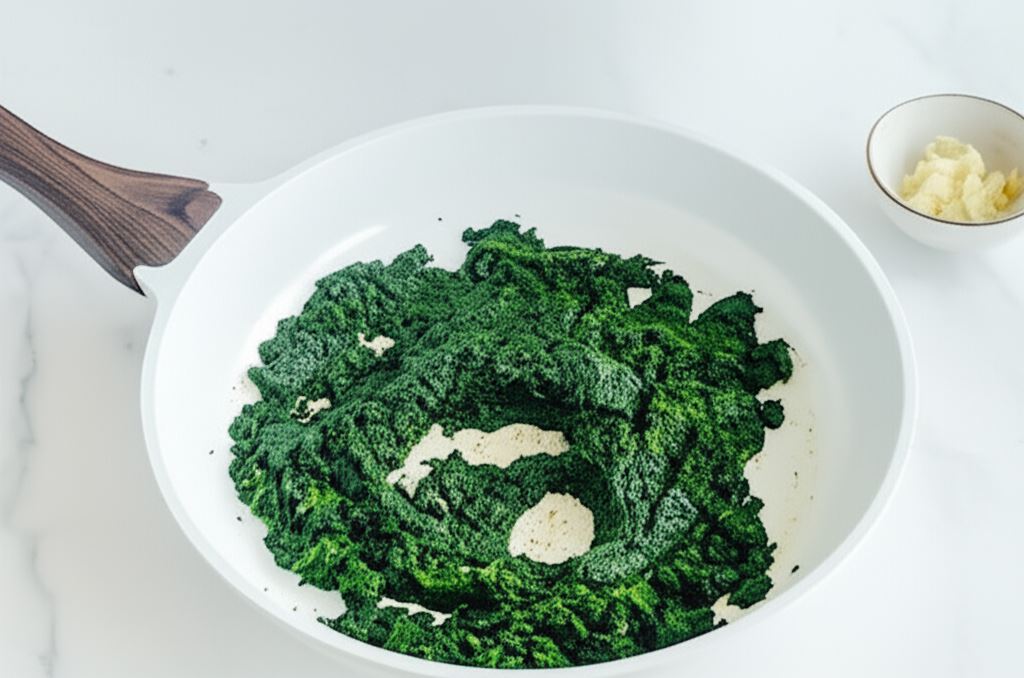 Na łyżce oliwy przesmażamy drobno posiekany czosnek i cebulę. Dodajemy szpinak i dusimy pod pokrywką, aż nadmiar wody odparuje.